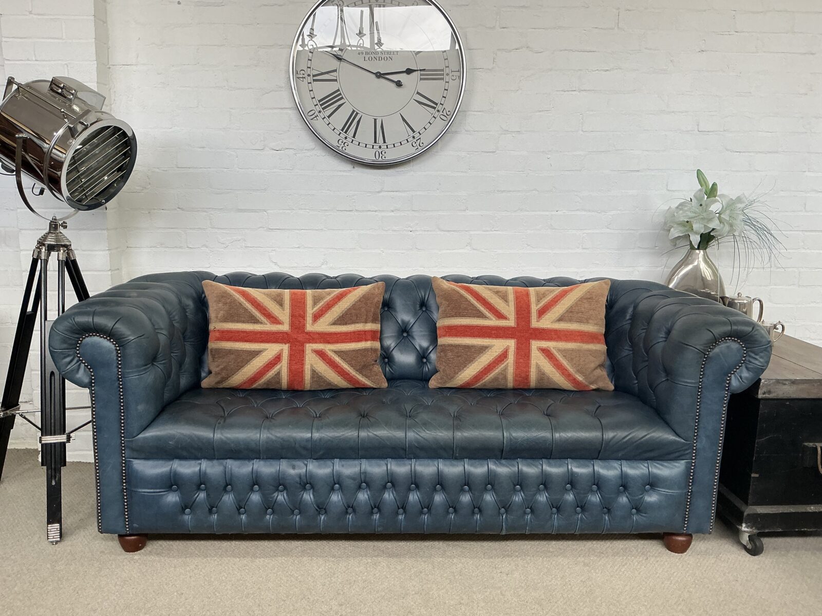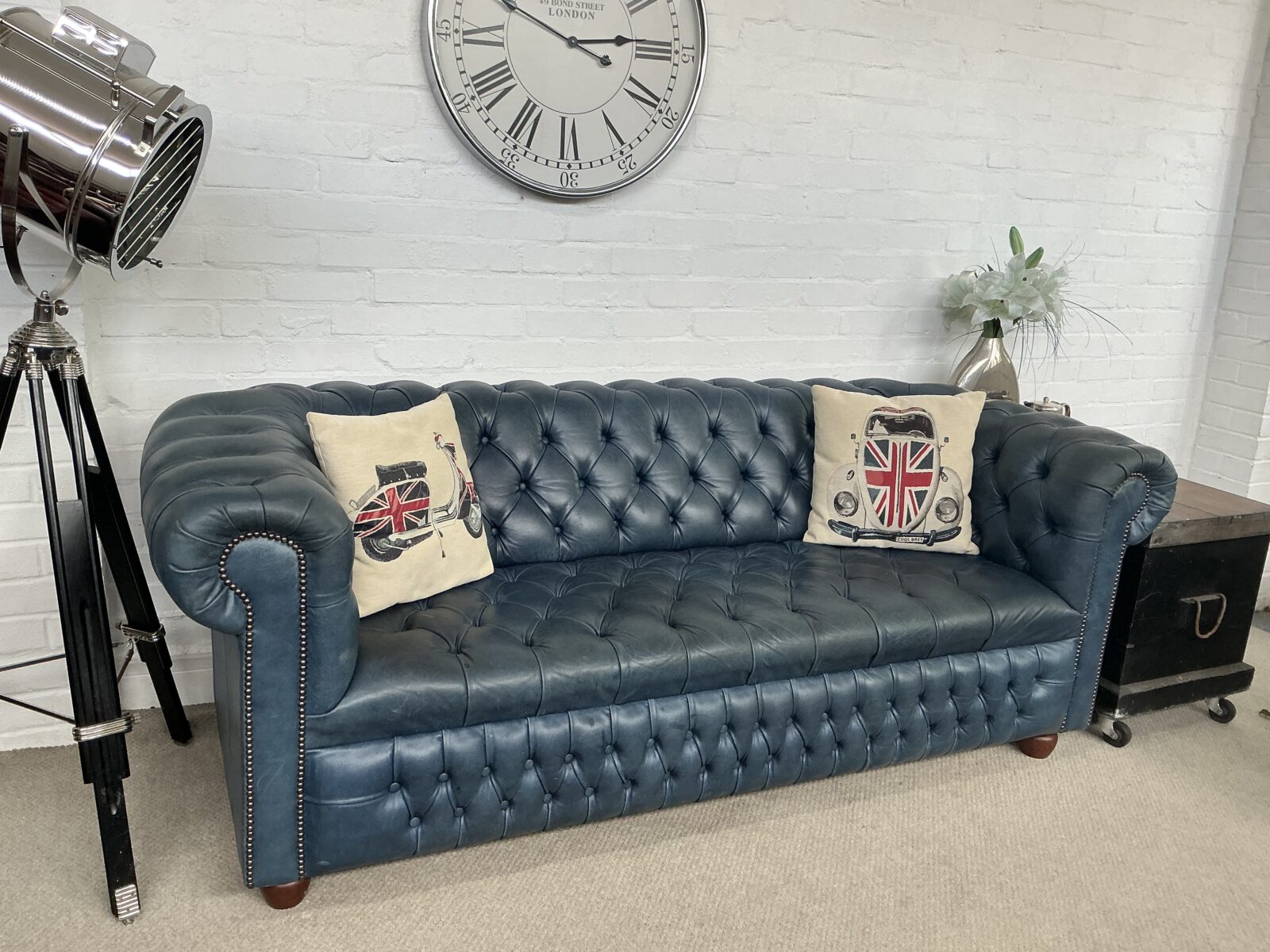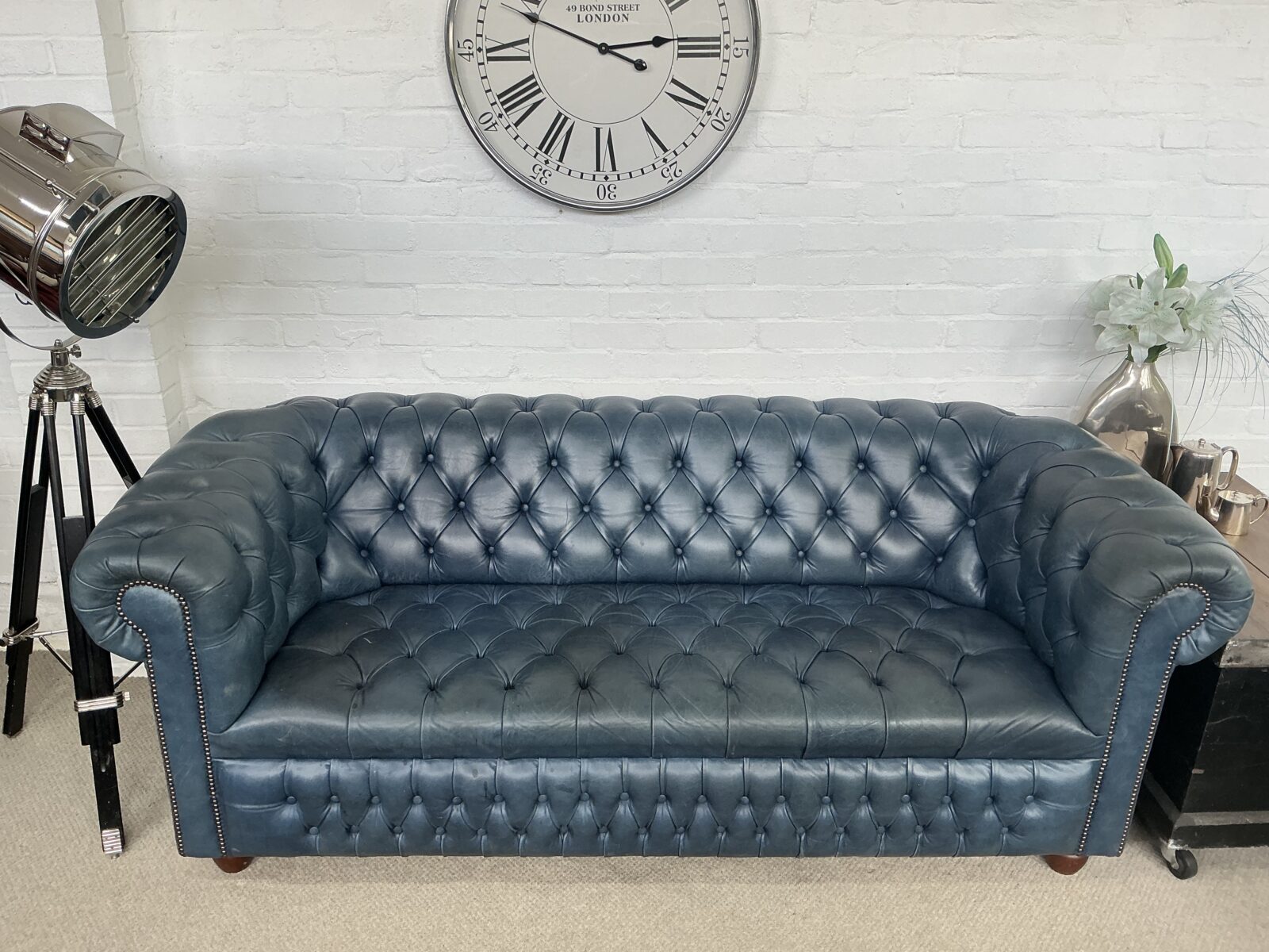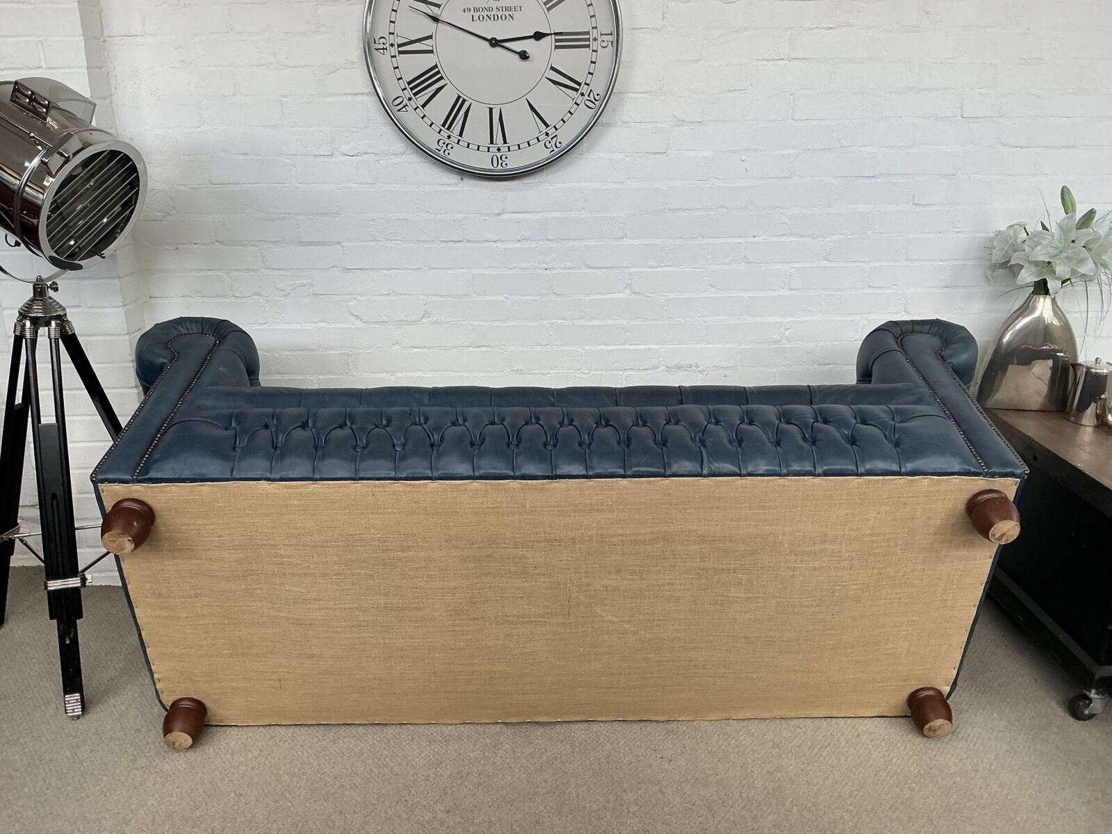 Finished in Denim Blue this fully buttoned 3 seater leather chesterfield sofa is in a great preloved condition.