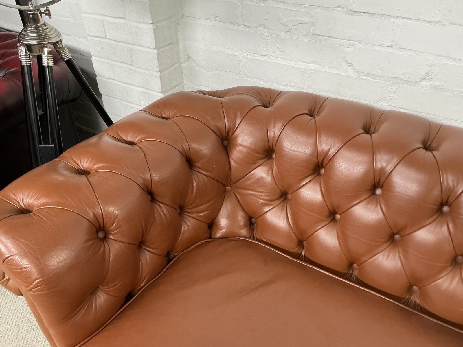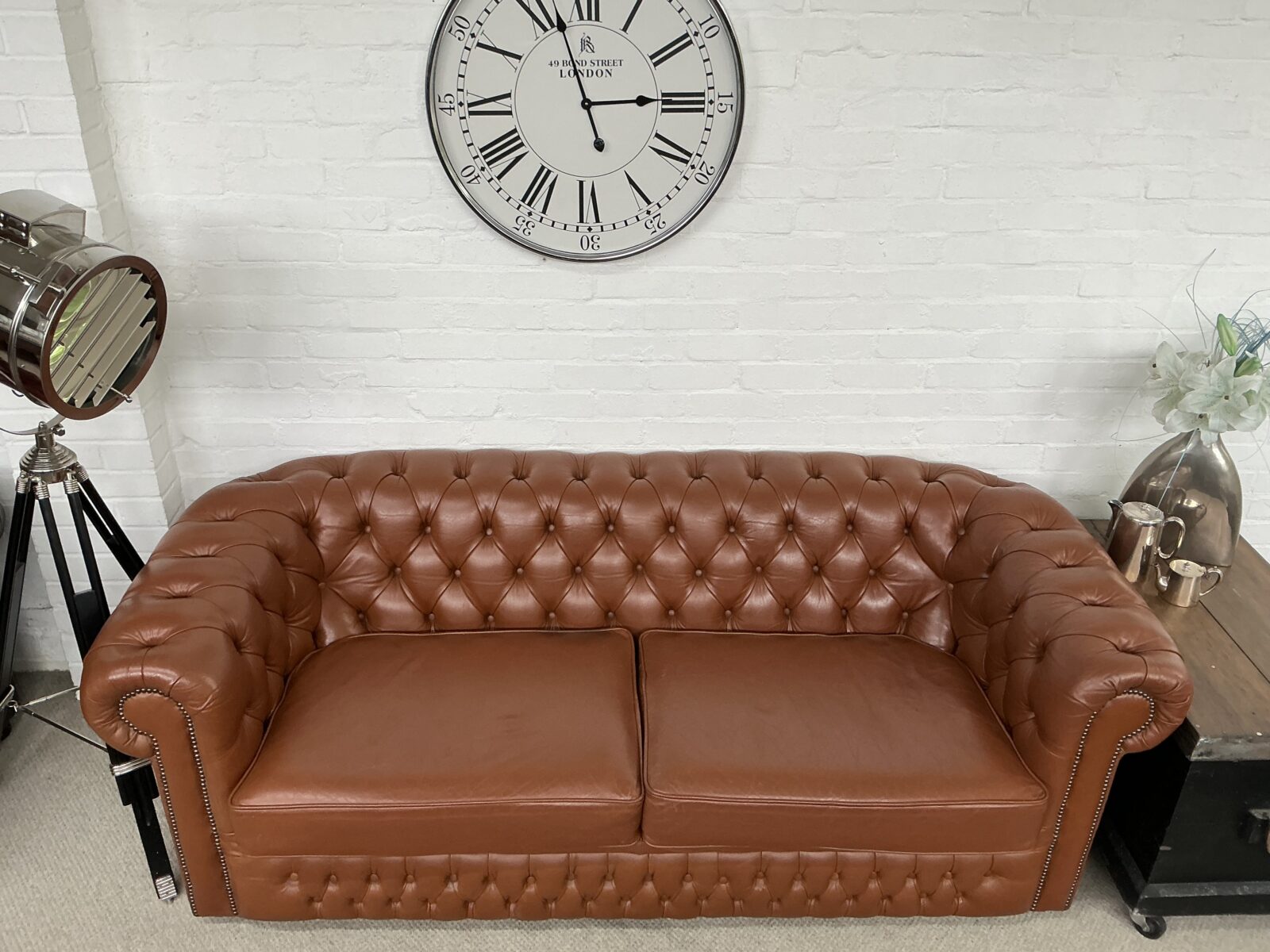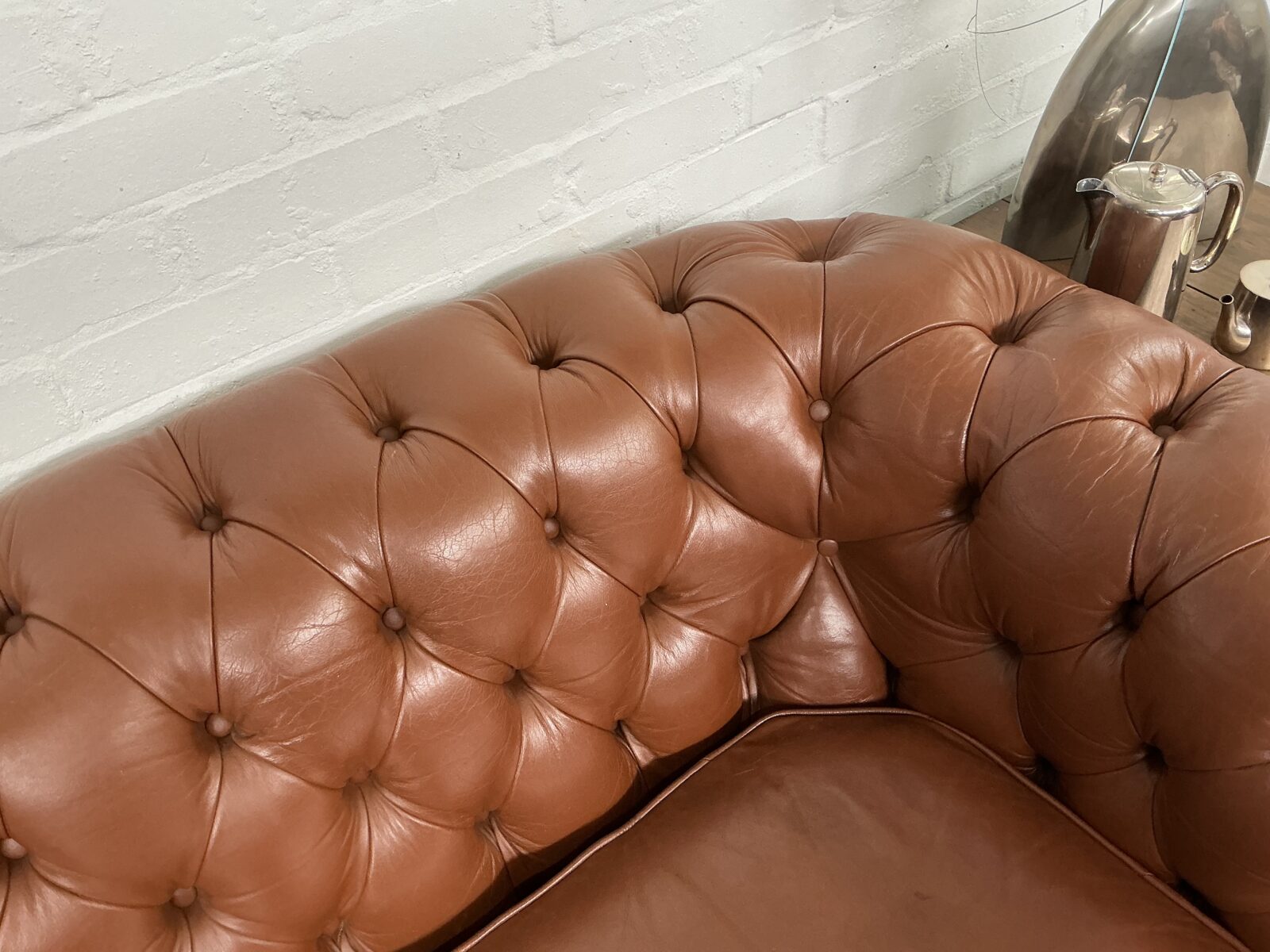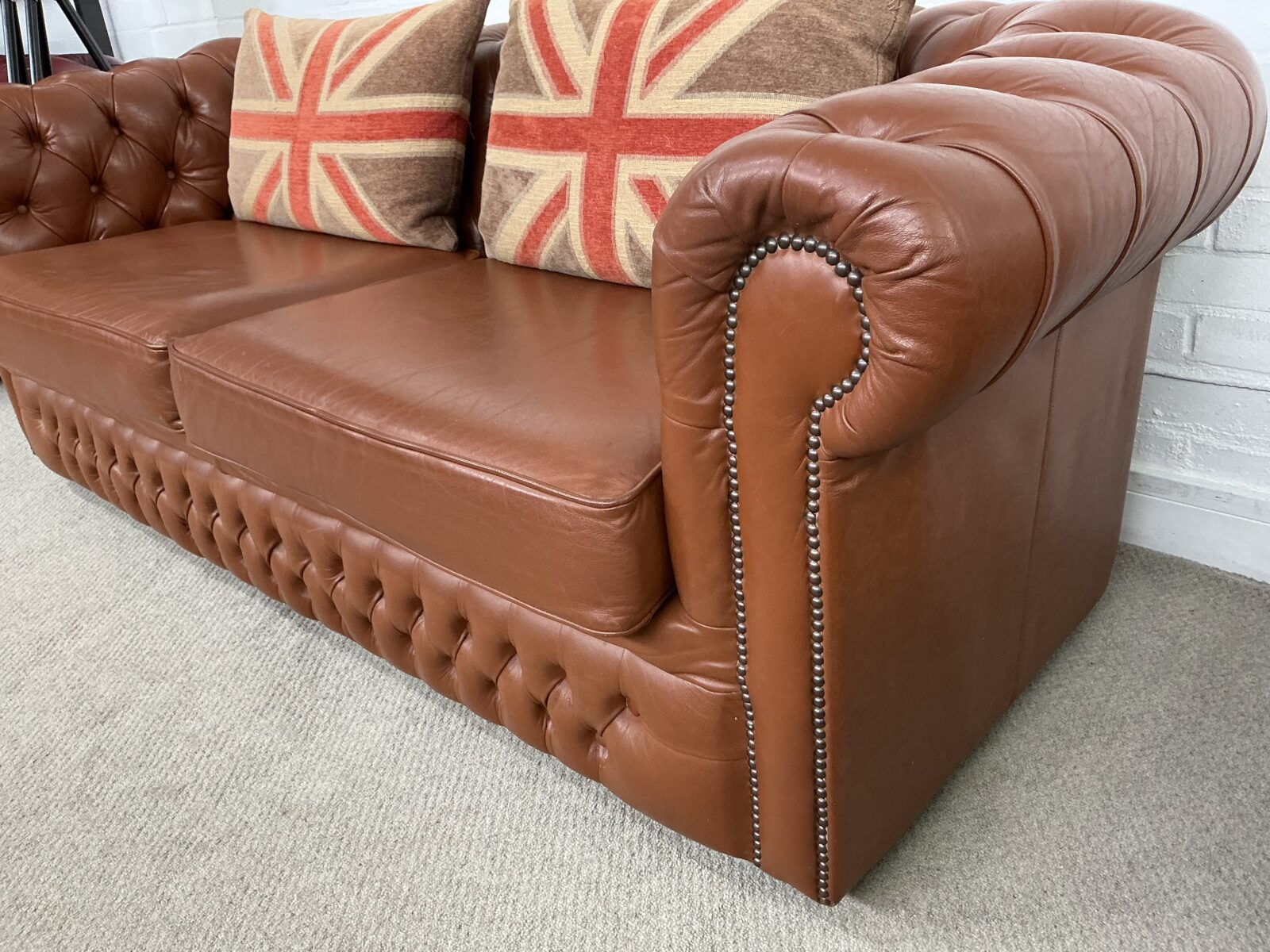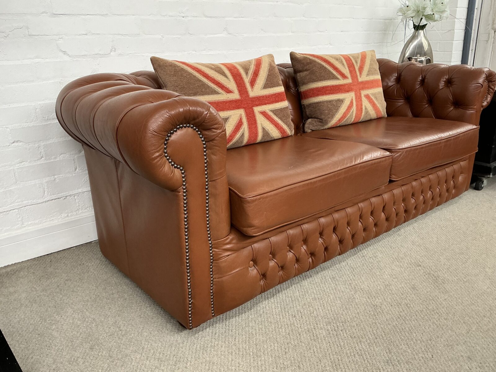 In excellent preloved condition this 3 seater leather chesterfield sofa is finished in classic Saddle Tan.